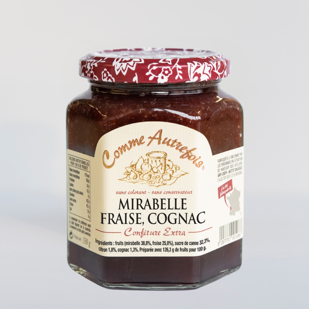 Mirabelle* (38 %), Fraise* (25 %), Sucre de canne* (36,7 %), Cognac* (0,3 %)